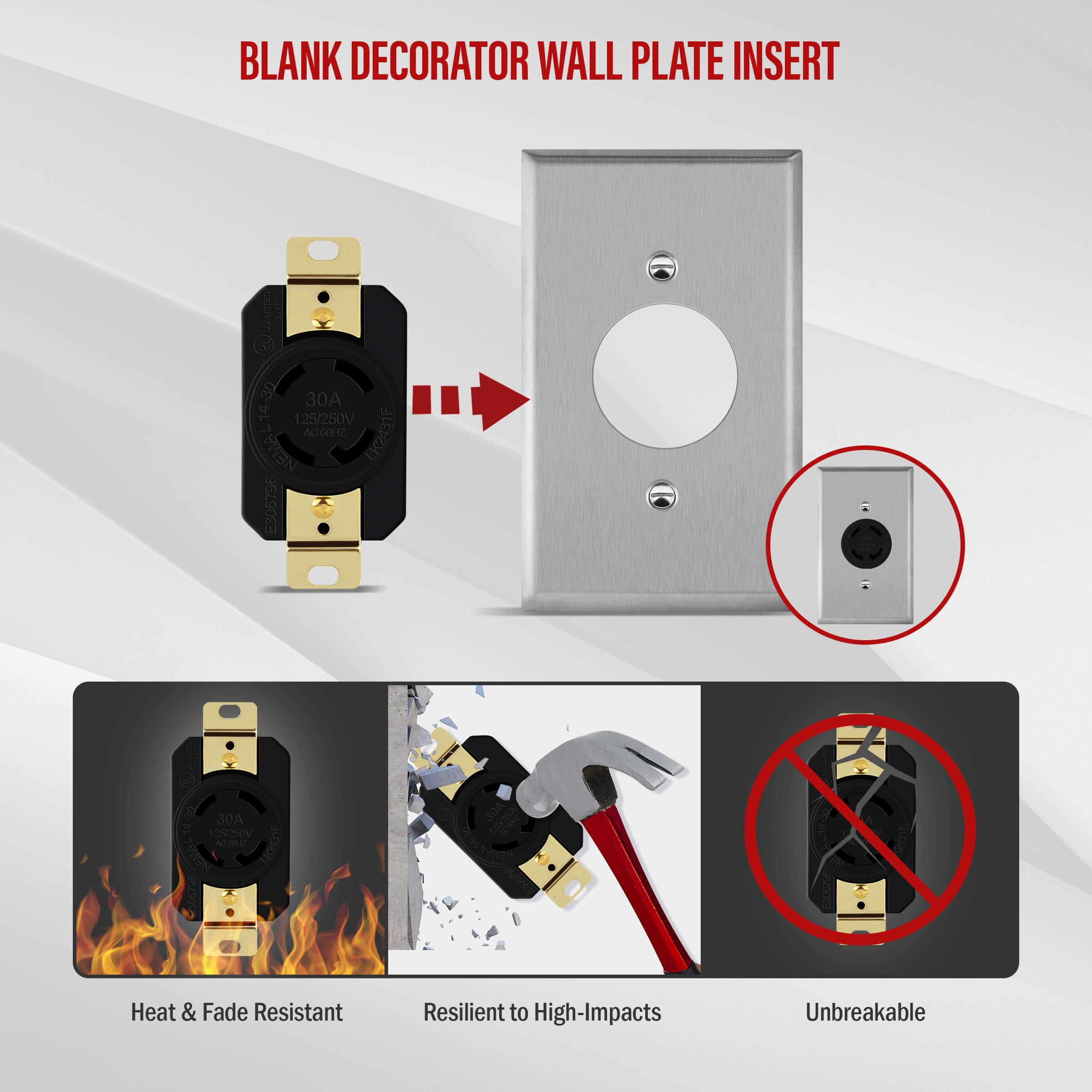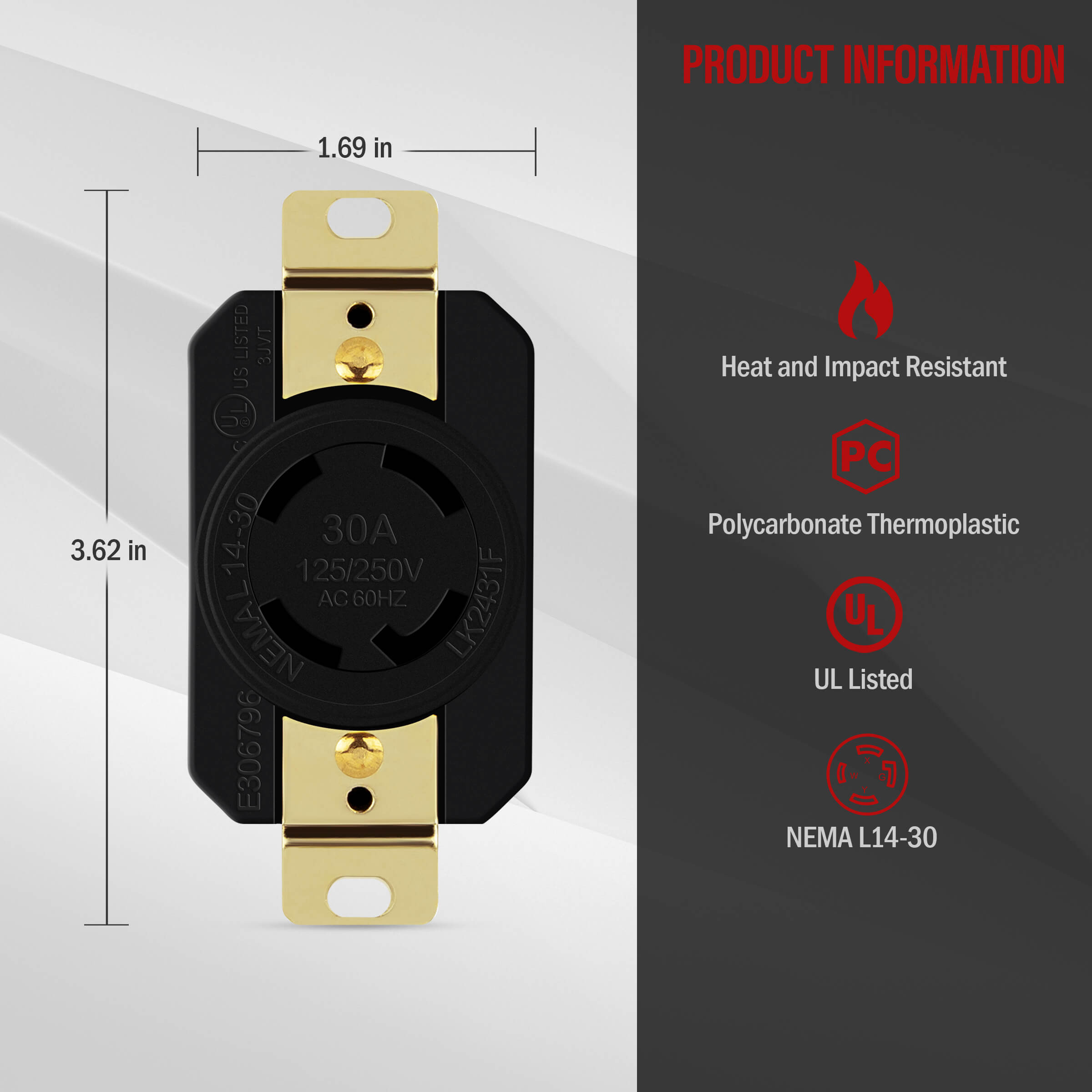 ENERLITES 66490-BK Industrial Grade 30A 125/250V Locking Receptacle: NEMA L14-30R, 3P, 4W grounding. Made with high impact-resistant nylon face and body with heavy-duty nickel-plated mounting straps. All receptacles are corrosion-resistant. Use in combination with locking plug 66470-BK, NEMA L14-30P. UL-Listed, 2-year warranty.