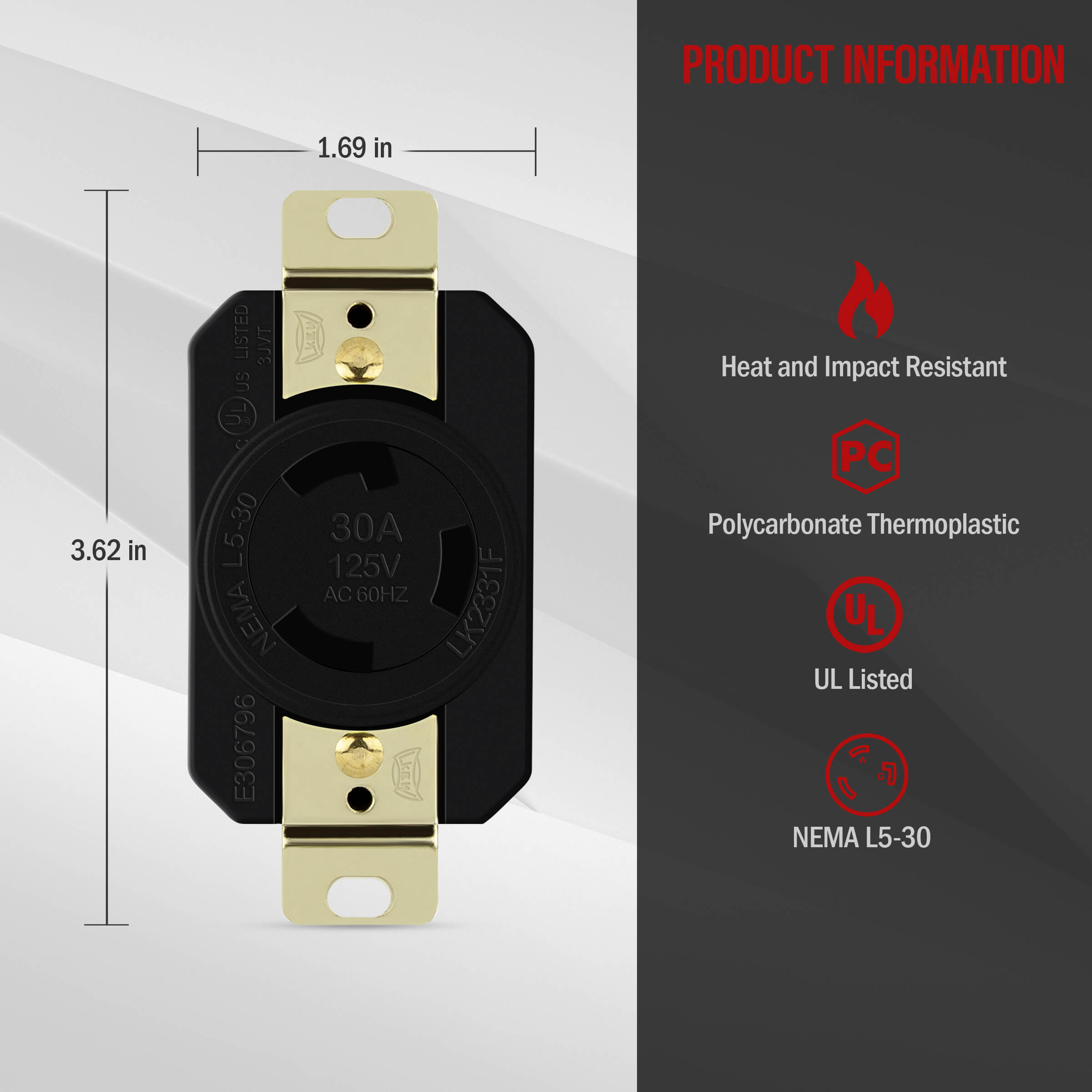 This NEMA outlet is made of impact-resistant nylon face and body with heavy-duty, nickel-plated mounting straps, making it highly durable in most applications. The NEMA configuration and device rating are clearly marked on the front. Use in combination with a NEMA L5-30P locking plug, such as Enerlites 66452-BK.