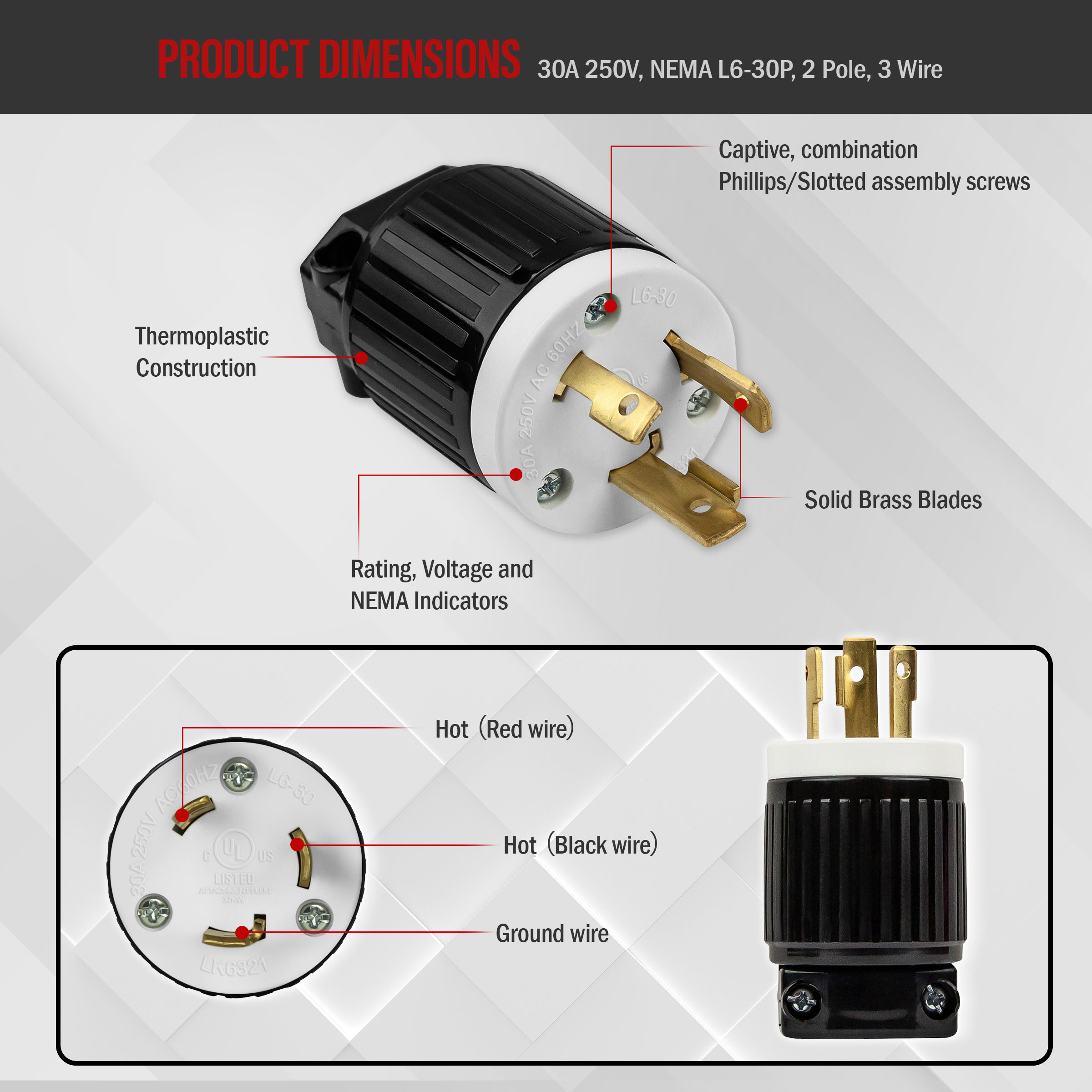 This NEMA locking plug is industrial/commercial grade and is made of highly durable polycarbonate thermoplastic with solid brass blades, making it virtually indestructible in most applications. The NEMA configuration and device rating are clearly marked on the front. Use in combination with a NEMA L6-30C locking connector, such as Enerlites 66462-BK.