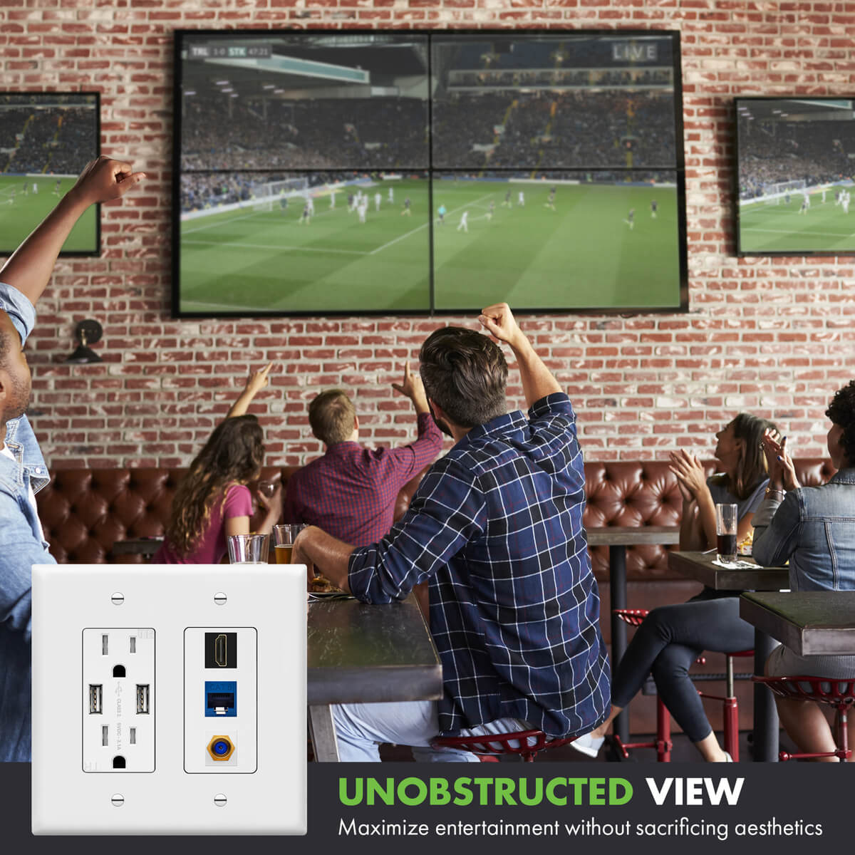 This kit from TOPGREENER has everything you need to help create the ultimate multimedia center. Designed for 2-gang wall box setups, this bundle includes a tamper-resistant outlet with dual USB ports (TU2153A-W), a 3-port keystone jack insert (6263-W), and three keystones including one coaxial (6101-BL), one ethernet (6110-BL), and one HDMI port (6107-BK). It also includes a mid-size wall plate (8832M-W) to complete the look.