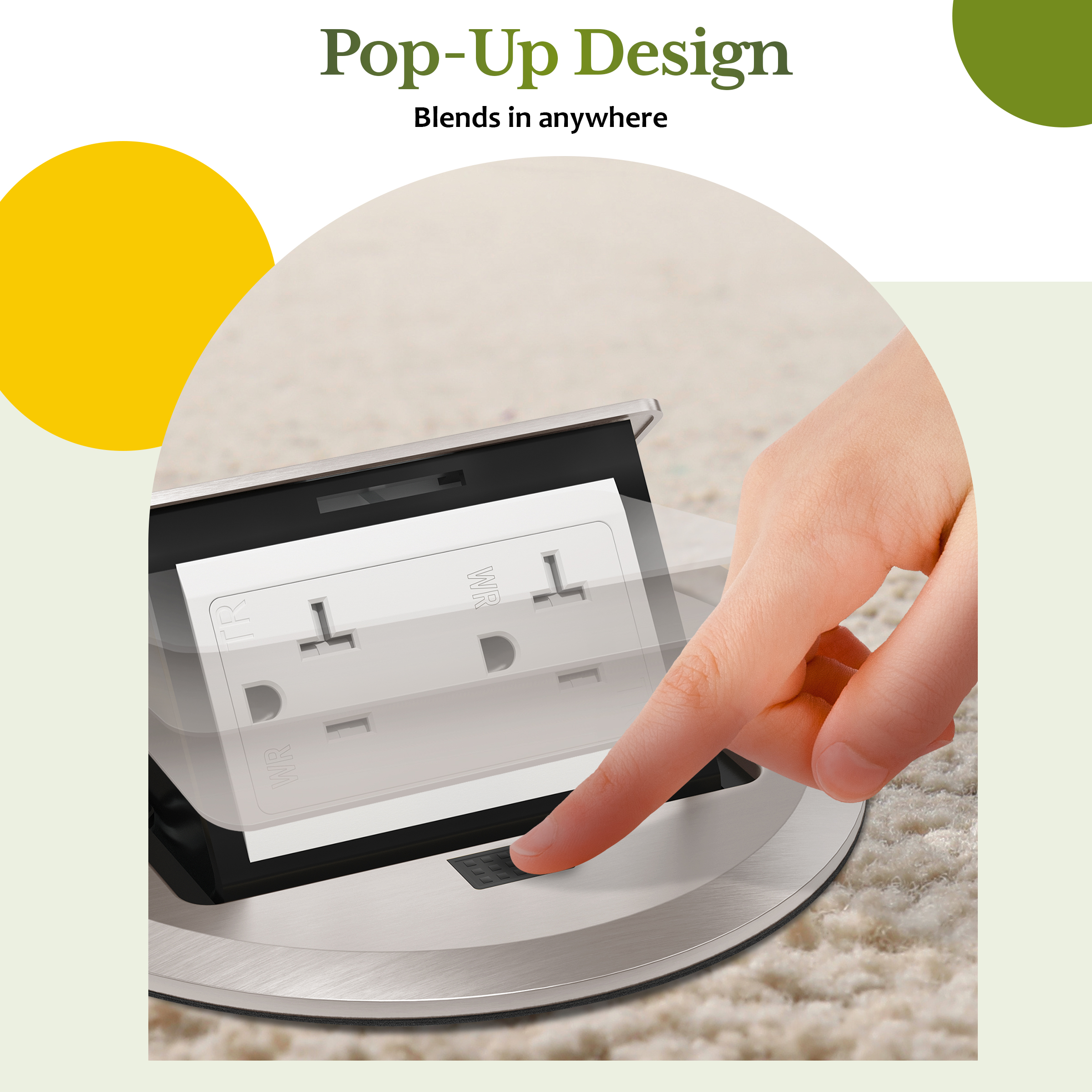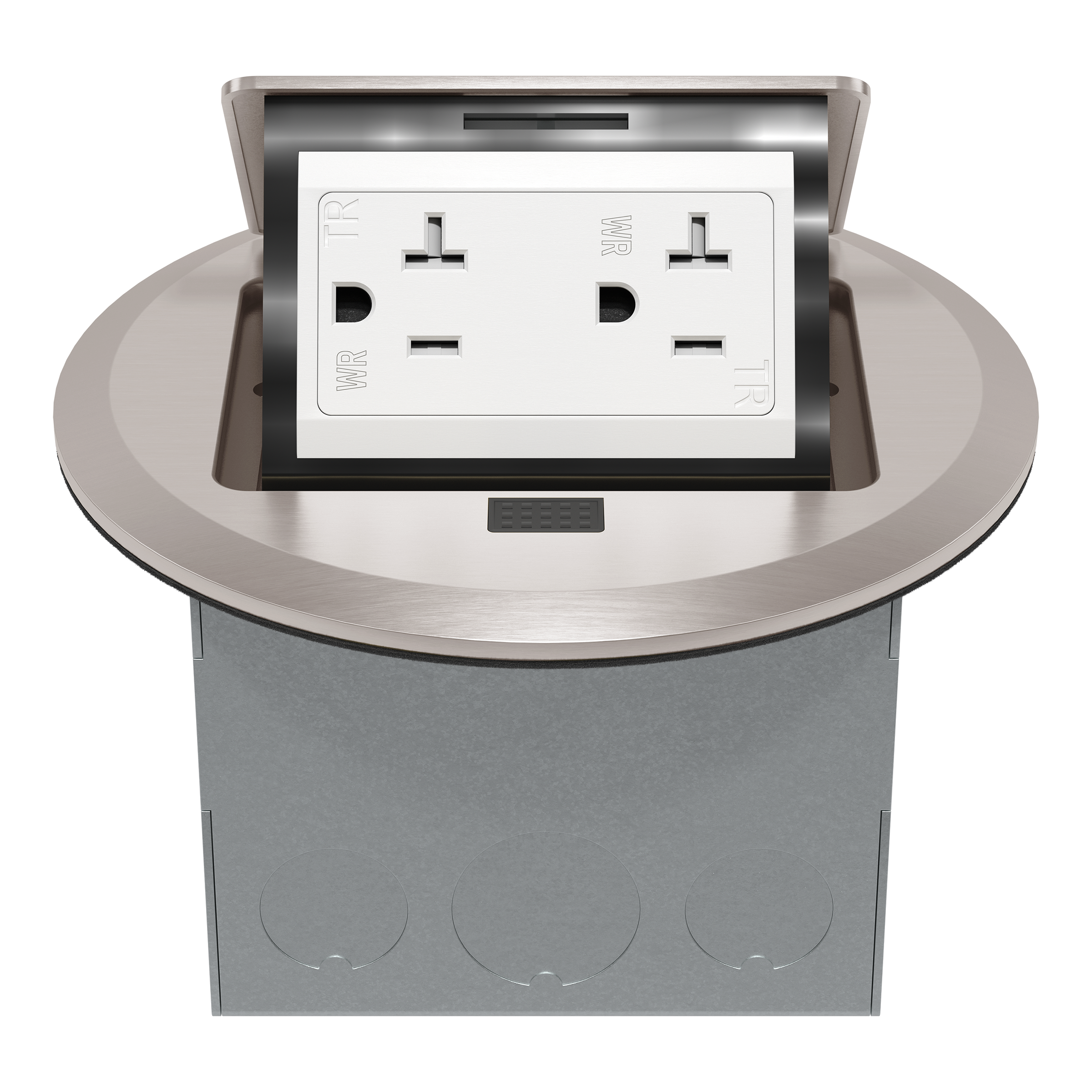 The TG FB-RP-20WR-S-N is a 1-gang stainless steel round pop-up floor box kit with a tamper-resistant decorator receptacle. The20A weather-resistant receptacle features tamper-resistant shutters to prevent the insertion of foreign objects. The floor box pops up for easy access to power; simply snap the cover closed when not in use. This insert helps maintain a clean and safe environment by preventing dust accumulation and electrical exposure. Made from high-quality thermoplastic, it resists impacts and offers a long-lasting finish suitable for both residential and commercial applications.