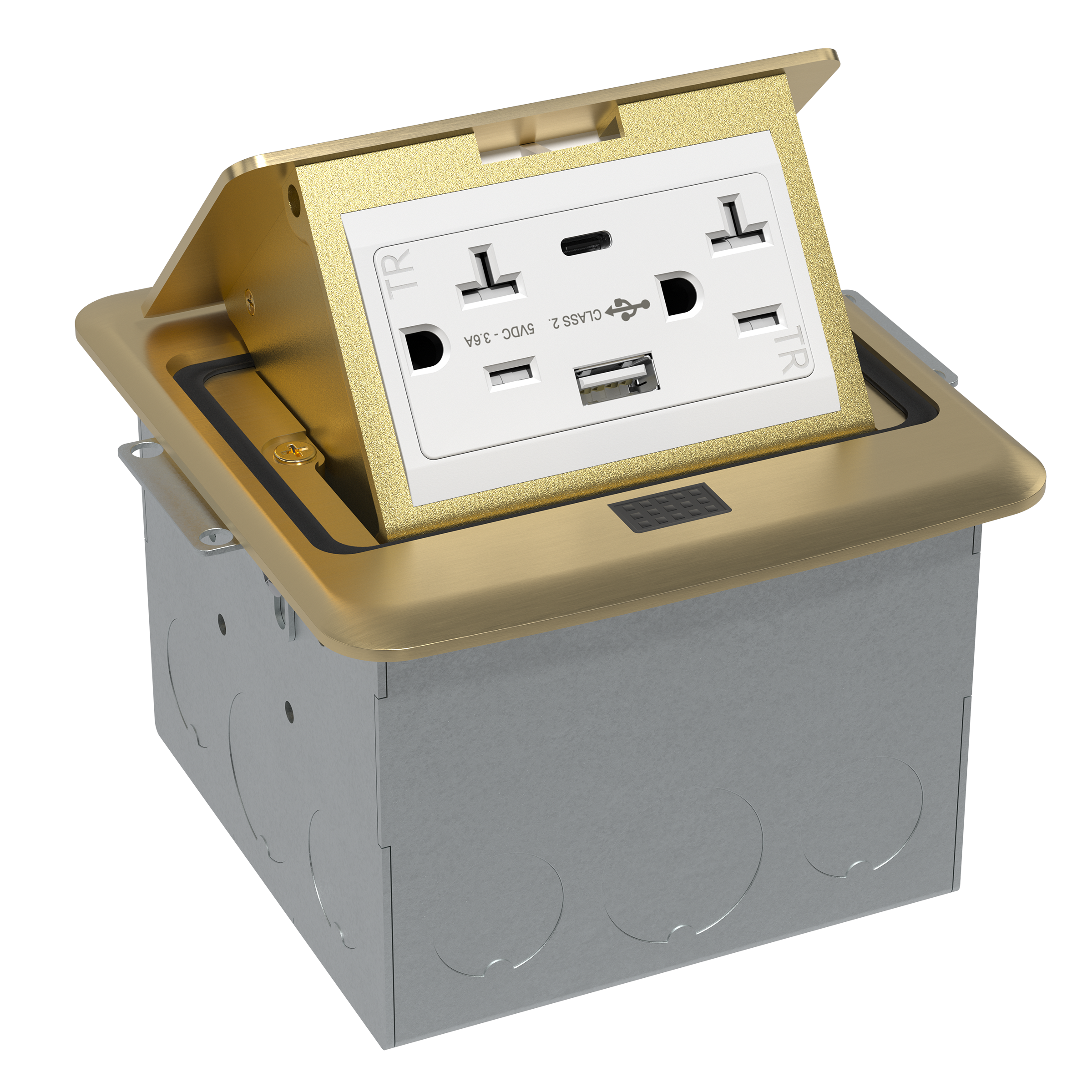 The TG FB-SSP-36AC-B-N is a 1-gang brass square pop-up floor box kit with a tamper-resistant decorator receptacle and type A/C charging. The 15A weather-resistant receptacle features tamper-resistant shutters to prevent the insertion of foreign objects. The floor box pops up for easy access to power; simply snap the cover closed when not in use. This insert helps maintain a clean and safe environment by preventing dust accumulation and electrical exposure. Made from high-quality thermoplastic, it resists impacts and offers a long-lasting finish suitable for both residential and commercial applications.
