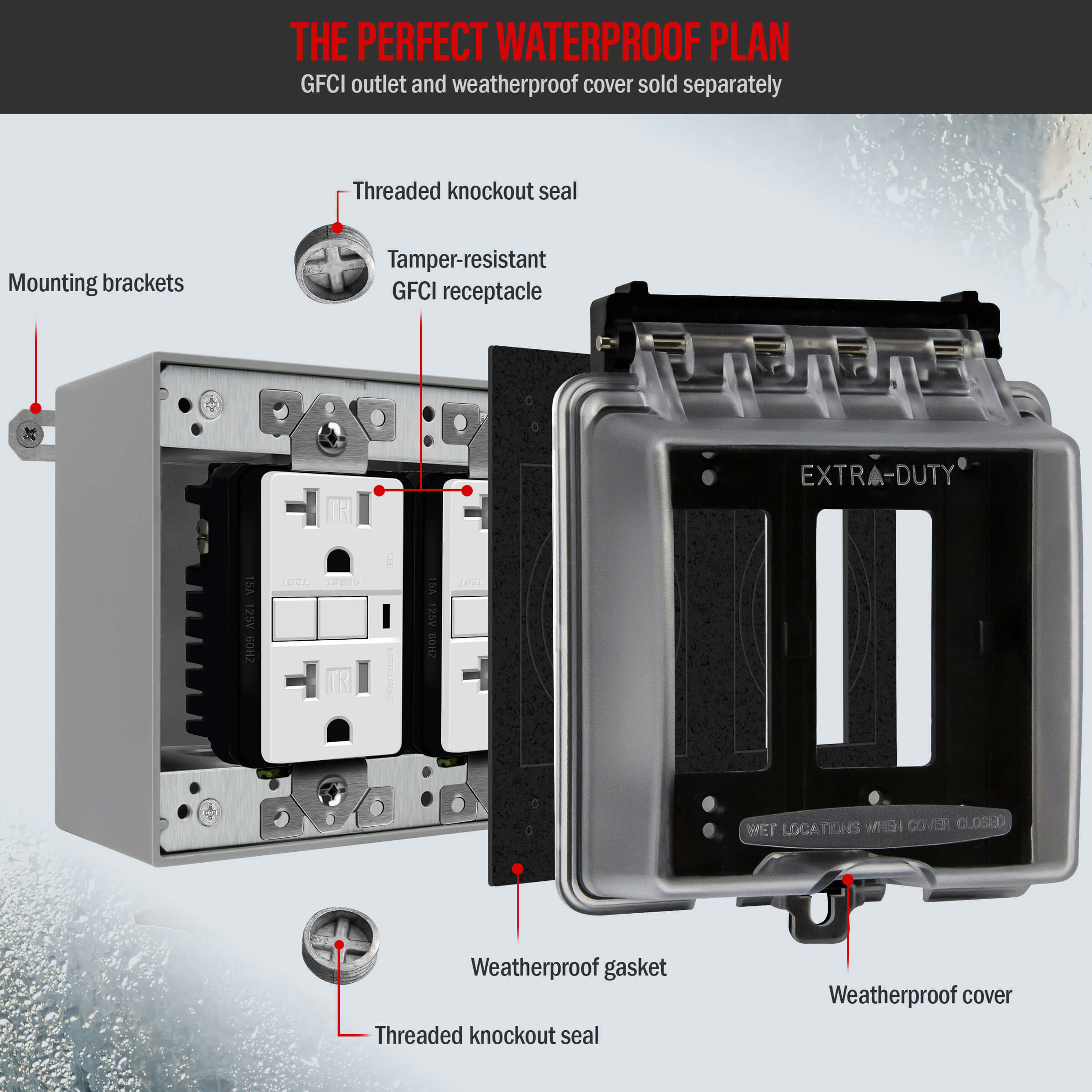 • Die-cast metal construction effectively seals out moisture, dust, debris, and insects to protect outdoor receptacles