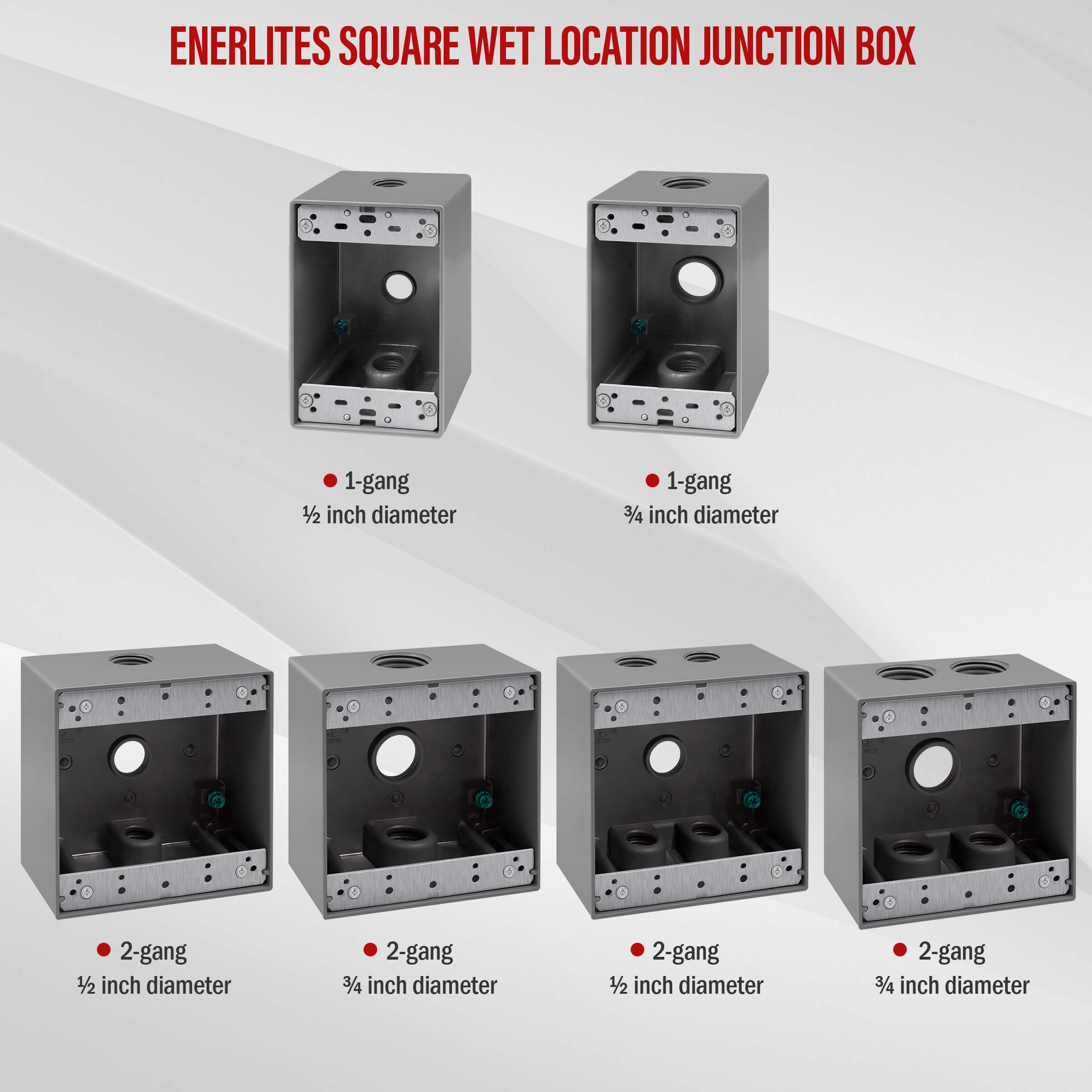 The ENERLITES 2575 weatherproof outlet box is a double-gang electrical box that features five 3/4-inch diameter knockouts. This 2-gang outlet box is designed specifically for installing switches and receptacles in moisture-prone or outdoor locations. The electrical box features a die-cast metal construction that seals out moisture, dust, debris, and insects to keep receptacles protected year-round and throughout any weather conditions. The gray-colored junction box is also powder coated for maximum scratch and corrosion resistance. This 2-gang weatherproof box is compatible with standard toggle switches, duplex receptacles, decorator switches/receptacles, and GFCI receptacles. The junction box is compatible with 2-gang weatherproof covers, such as ENERLITES models IUC2V-D or 7702-WP (wall plates sold separately). The outdoor outlet box comes with a pre-installed grounding screw, closure plugs, mounting lugs, and installation screws to make installation as fast and easy and possible. This product is UL & CUL listed and complies with NEC 2017 406.9 for a weatherproof enclosure in damp locations. Includes a one-year warranty.